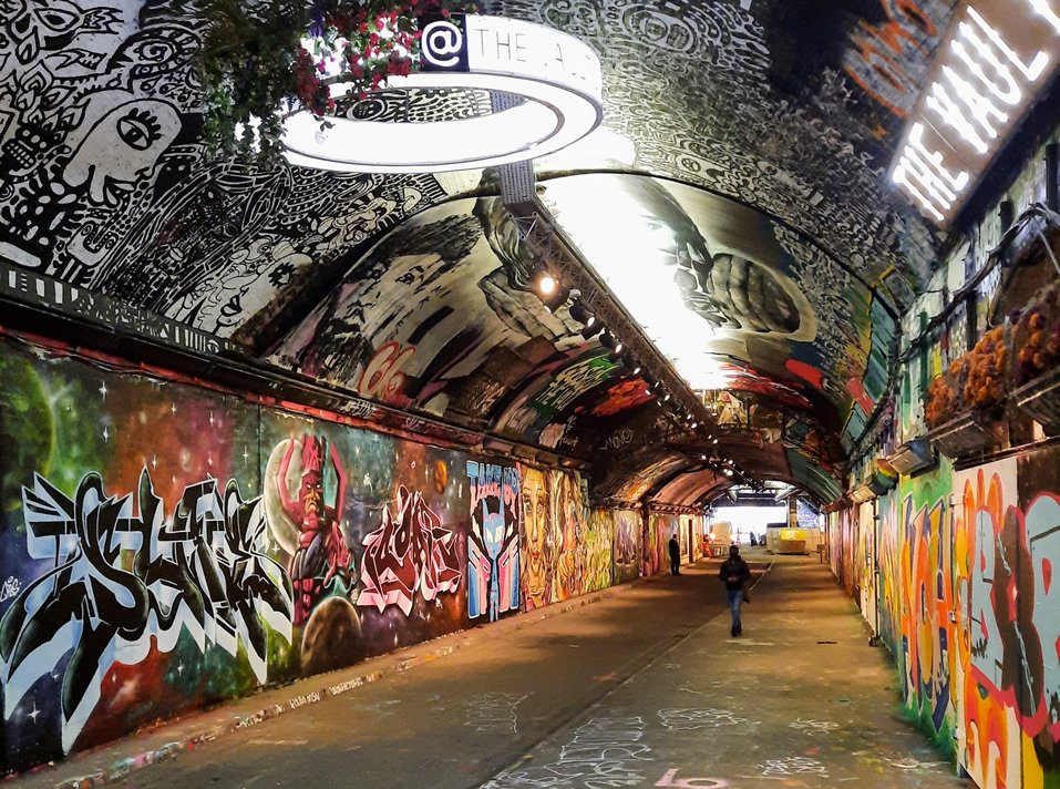 Under Waterloo station’s crowded platform and rumbling tracks is a street artist’s playground. A five-minute walk from the main station exit is Leake Street (just off York Street), which will bring you to an authorised graffiti area known as the hidden Waterloo Station street art tunnel.It’s a hidden art space in the Leake Street arches, often only stumbled upon by locals and spread through word of mouth.It’s a permanent fixture hidden from view and casually bypassed by those eagerly seeking the beauty of the Southbank and the London Eye. But it is a space where the creatives come to express themselves with relative freedom.The area was first used by Banksy back in 2008 for an art display with the aim to “transform a dark forgotten filth pit” into “an oasis of beautiful art”.The location has been kept a secret until the unveiling and since then it’s been a canvas for anyone with a paint can to come and dominate a space.The street art in London generally is constantly changing, getting bigger, more expressive and finding new spaces to fill. A good overview of the murals can be found in this picture essay of Shoreditch street art and for those wanting minute detail on artists and hidden corners, check out the recommended Shoreditch Street Art Tours.Just as the art in the Waterloo tunnel is always evolving, these spaces create a location that is more than a one-time visit.